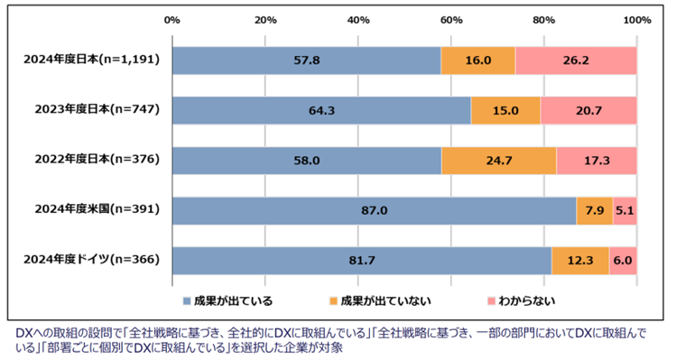 また、「DXによって成果が出ているか」という問いに対しては、日本はアメリカやドイツと比較して大きく遅れを取っている状況です。日本人の特性として、謙虚な姿勢から「成果が出ている」とは言いにくい傾向も考えられますが、取り組みの割合がドイツより高いにもかかわらず、成果面では遅れを取っている点は、やはり残念な結果と言えるでしょう。