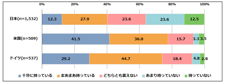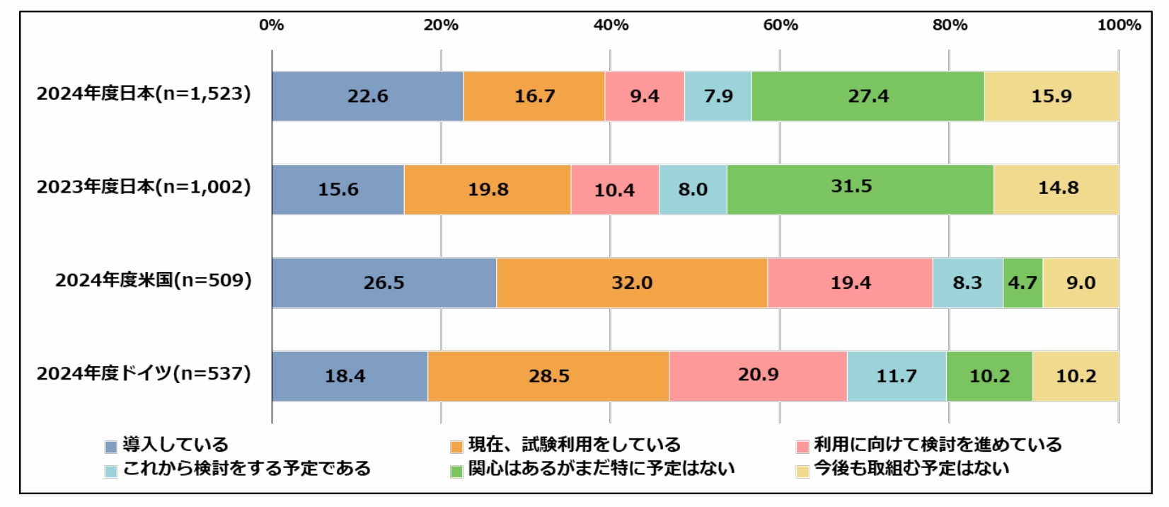 生成 AI について前向きな取組みをしている企業の割合は、米国では8割弱、ドイツでは7割弱となっていますが、日本では5割弱にとどまっています。日本は「関心はあるがまだ特に予定はない」と答えた企業が米国とドイツに比べて非常に多いのが特徴的です。
