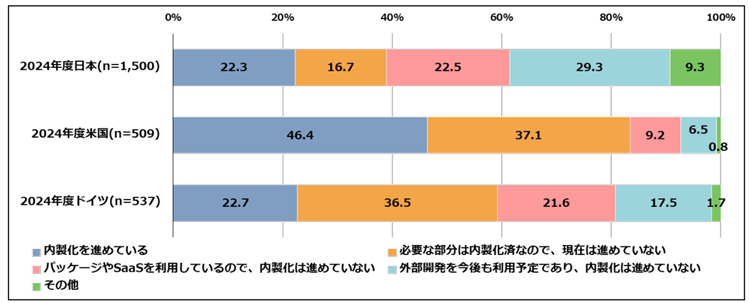 システム開発の内製化を確認すると、「内製化を進めている」の回答割合は米国が最も高く、日本・ドイツと差がついています。また「外部開発を今後も利用予定であり、内製化は進めていない」の回答割合は日本が高く、依然として外部開発を利用する企業も多い傾向が続いています。