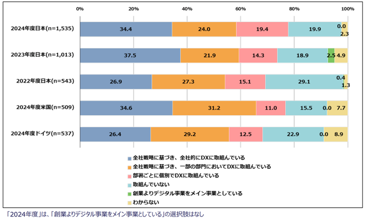 実際に、日本のDXへの取り組み状況を2023年と2024年で比較すると、やや後退していることが分かります。全社的に取り組んでいると回答した割合は、37.5%から34.4%へと減少しました。