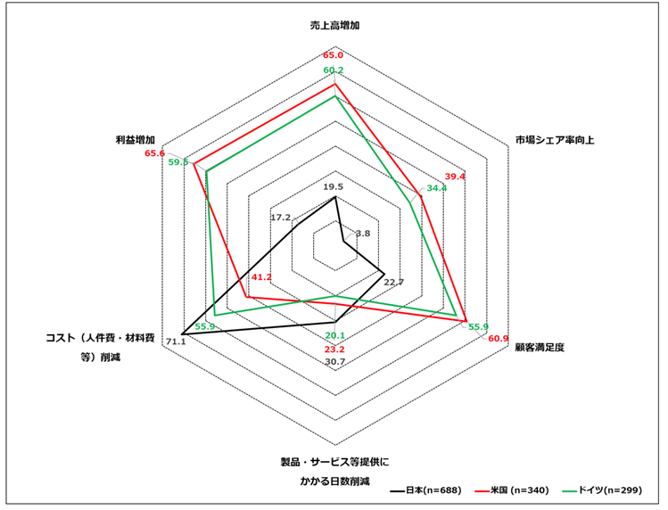 それでは成果の内容について確認します。次のグラフは日米独で大きな差がついています。日本の成果は、「コスト削減」に絞られている一方で、米独ではまんべんなく成果をだしており、特に「売上や利益の増加」というところで差が大きいです。