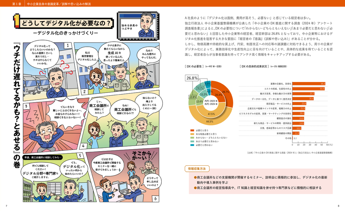 この冊子は、2024年4月に日本商工会議所が中小企業のデジタル化が進展しない要因を分析し、デジタル化推進に向けて考えられる方策や手段、道筋を示し、そのために必要な具体的アクションを提言として取りまとめした提言の内容をわかりやすくマンガ形式にした冊子です。【冊子のイメージ】