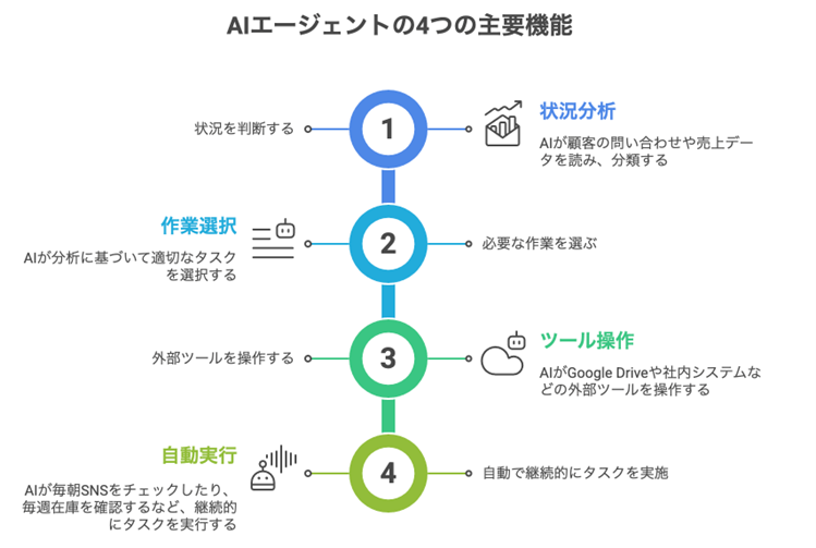 それに対して、AIエージェントは、指示を受けなくても自律的に判断し、タスクを実行するAIのことを指します。ChatGPTのように「質問に答える」だけでなく、目的を理解したうえで、自ら調べ、考え、必要な作業を継続的に行うことができます。