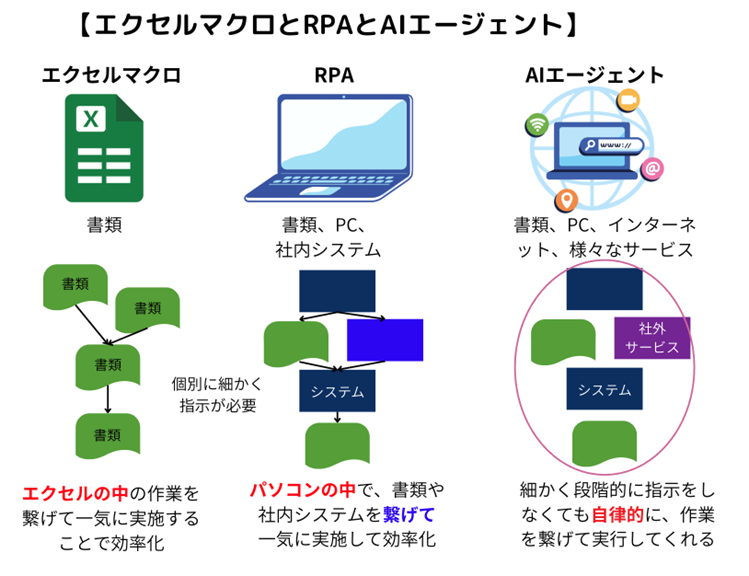 これまでも業務の効率化を目的として、さまざまな自動化の取り組みが行われてきました。たとえば、Excelマクロを使って複数の書類を組み合わせたり、集計作業を自動化したりすることが行われてきました。