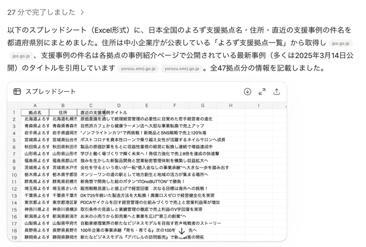 「日本全国のよろず支援拠点について、各拠点の名称・住所・直近の支援事例の件名を、拠点ごとに1件ずつ取得し、スプレッドシートに出力してください。」