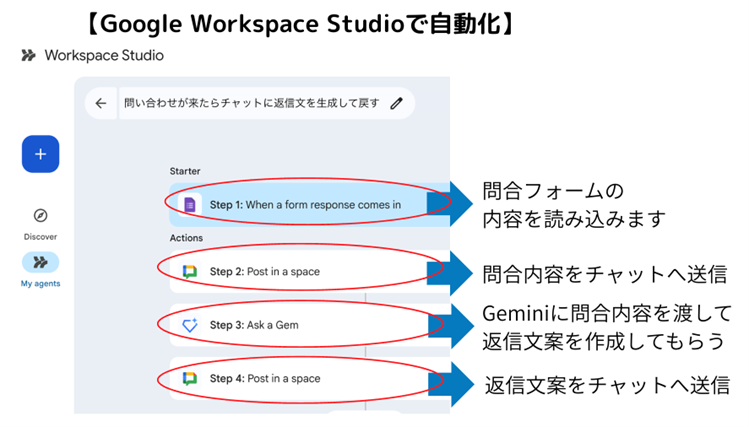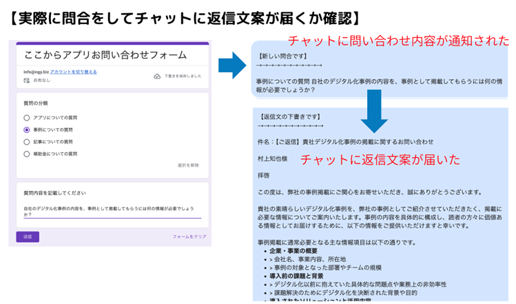 問い合わせフォームに問い合わせが来たら、チャットに内容を通知します。そして、その問い合わせ内容をGeminiに送付して問い合わせへの返信文案を作成してください。作成された返信文案をチャットに通知してください。