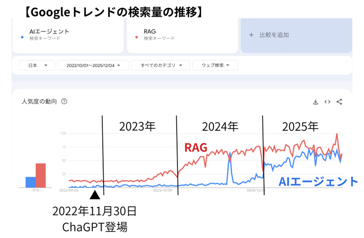 2022年末にChatGPTが登場しましたが、当初はインターネット上のテキストやイラストを生成する機能に注目が集まりました。しかし、2024年になると、社内データを活用して学習できる「RAG」に関心が高まり、さらに2025年には、社内業務をより自動化できるということで「AIエージェント」が話題になりました。