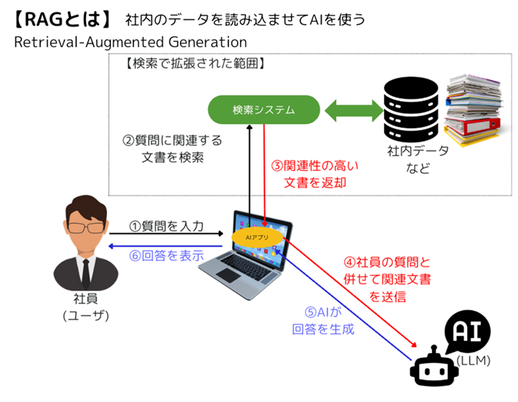 RAGとは、「検索拡張生成(Retrieval-Augmented Generation)」と訳されている技術です。社内にある資料をAIに読み込ませることで、社員はその内容についてチャットボットを通じて質問できるようになります。