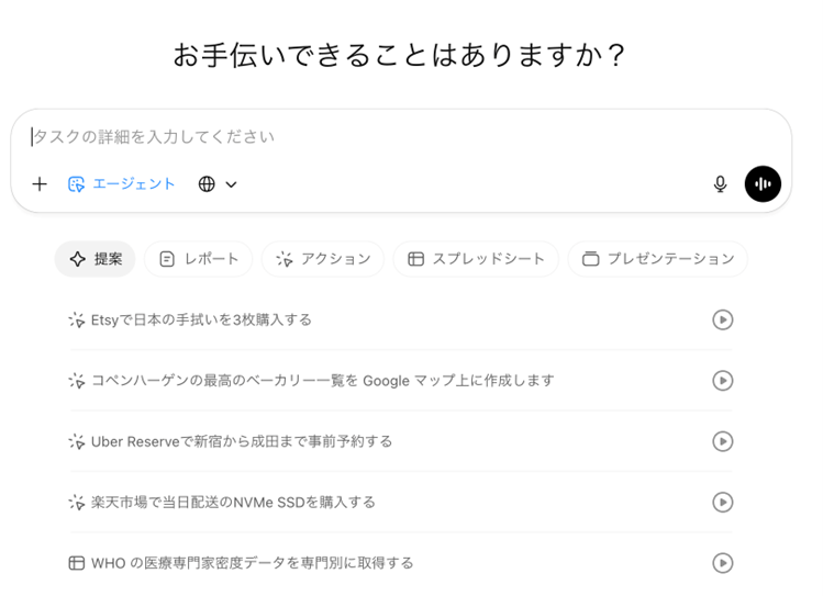 ChatGPTAgentは現状(2025年12月時点)では、有料プランでのみ提供されています。エージェントモードを選ぶと色々利用例を提示してくれています。